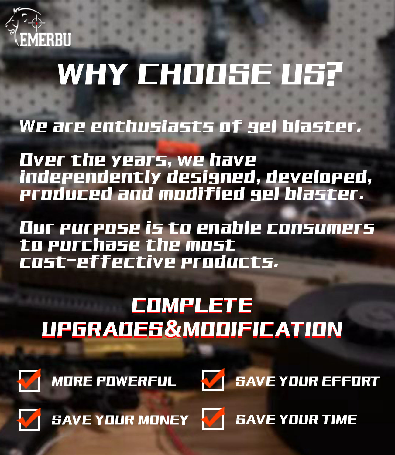 EMERBU is different from other sellers. Other sellers simply resell their products, while EMERBU improves each blaster before selling it